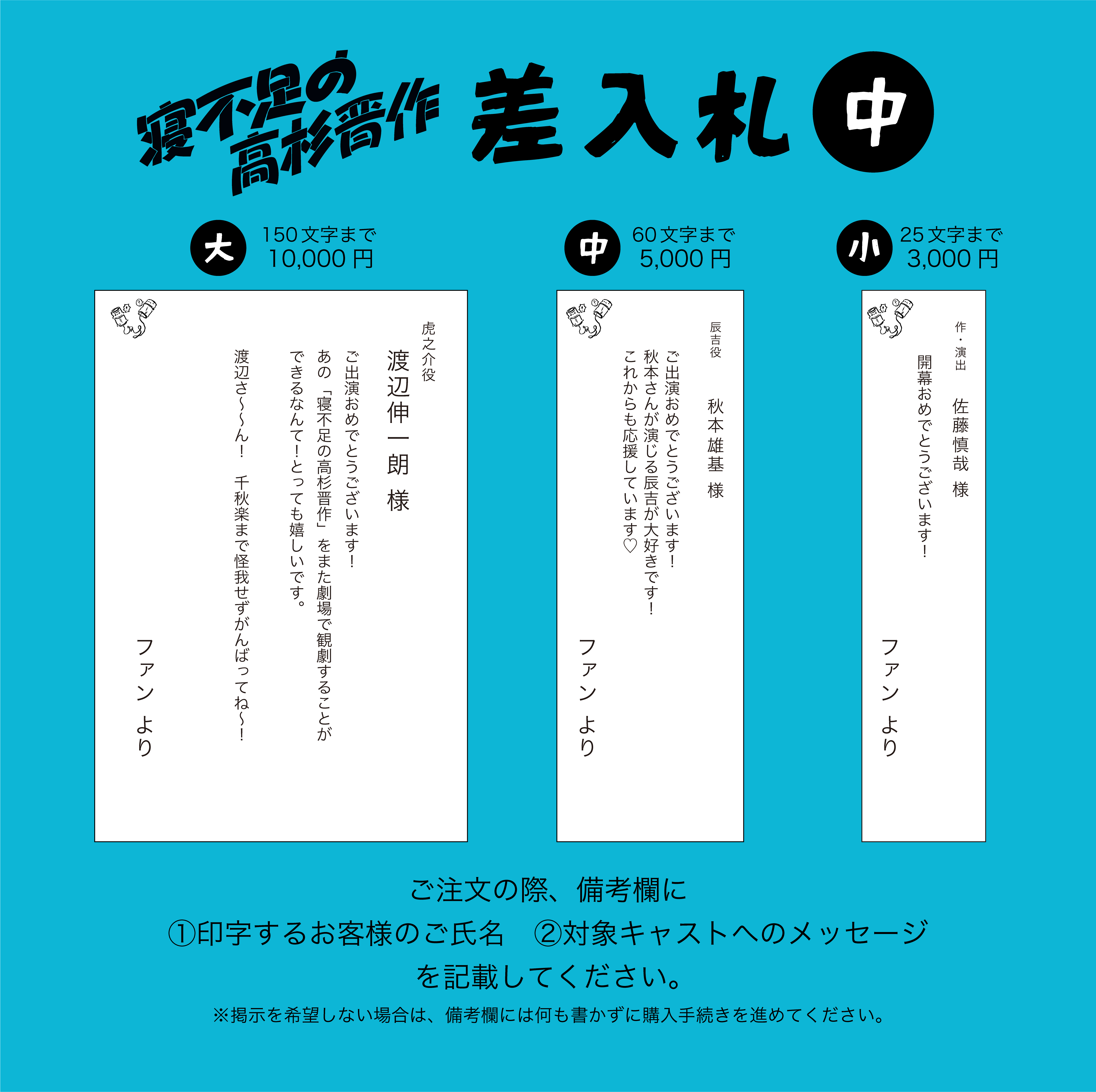 ・公演期間中の場合、前日21:00までに決済完了した差入札は翌日〜公演最終日に掲示します。